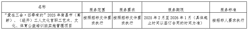 二、项目名称:“爱在工会·四季有约 ”2025年南昌市(高新)、(经开)工人文化宫职工艺术、文化、体育公益培训班实施管理项目