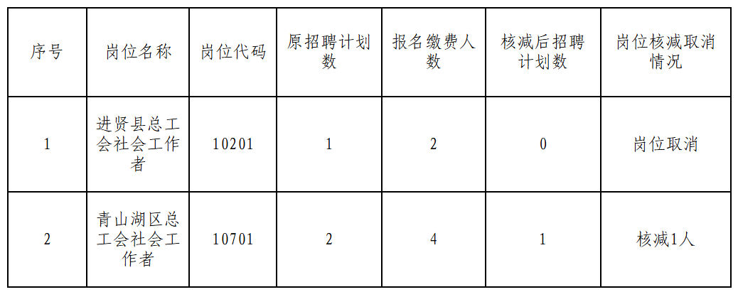 根据《公告》要求,“本次招聘开考比例为1:3,未达到开考比例的岗位,则相应核减或取消该岗位的招聘计划。”“岗位核减、取消情况将在南昌人才招聘网上公布,请考生及时关注。被取消岗位的考生可在规定时间内进行一次网上改报,未改报的可退回已缴笔试考试费。被核减招聘人数岗位的考生不得改报。改报期间不接受未报名人员注册报名。”现依照报名情况,取消10201-进贤县总工会社会工作者岗,核减10701-青山湖区总工会社会工作者岗。