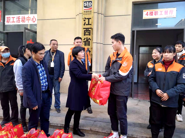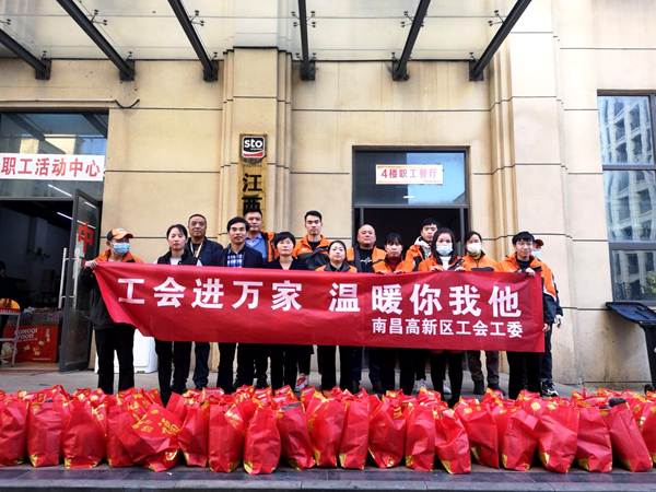 张诗超一行先后来到江西申通快递、华润江西医药等企业,为48名快递从业人员、货车司机等新就业形态劳动者送上内含暧水杯、手套、雨衣、护膝、口罩等劳保用品、防疫用品的大礼包,并为他们购买医疗互助保障,筑牢新就业形态劳动者的多重保障。