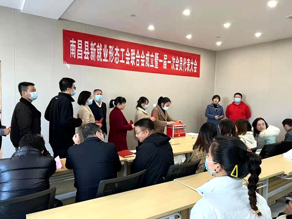 11月25日,南昌县新就业形态工会联合会在县职工服务中心二楼召开成立选举大会,来自县总工会、小蓝经开区总工会、向塘开发区工会以及物流、外卖企业的55名会员代表参加会议。县总工会基层部部长、新就业形态工会联合会筹备组组长王爱珠主持会议。