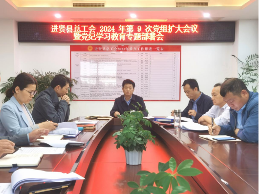 4月19日上午,进贤县总工会召开党组扩大会议,传达学习市总工会十五届三次全委会精神,以及市工会维护劳动领域政治安全工作座谈会精神。县人大常委会副主任,县总工会党组书记、主席邓必勇主持会议并讲话。县总工会班子成员和各部室负责人参加了会议。