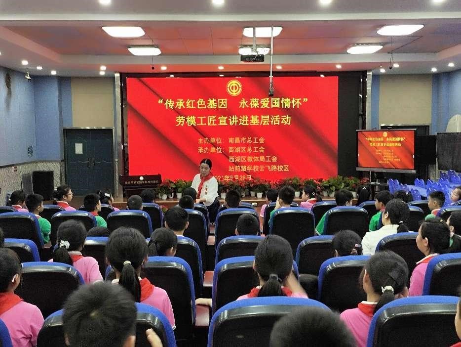 为深入学习贯彻习近平新时代中国特色社会主义思想,大力弘扬劳动精神、劳模精神和工匠精神,充分发挥劳模工匠的榜样引领作用,引导学生学习劳动模范的先进事迹和优秀品质,5月28日,由南昌市总工会主办、西湖区总工会和区教体局工会承办的“传承红色基因 永葆爱国情怀”劳模工匠宣讲进基层活动在南昌市站前路学校教育集团云飞路校区开展。四年级中队辅导员和110名少先队员参加了此次活动。
