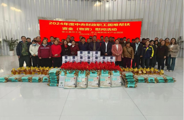 岁在寒冬,温情相伴。11月28日上午,安义县总工会在县高新园区开启了2024年度中央财政职工困难帮扶资金(物资)慰问活动。县人大常委会副主任、总工会主席胡晓波,县总工会常务副主席袁青平出席了活动,为困难职工送上了冬日关怀。
