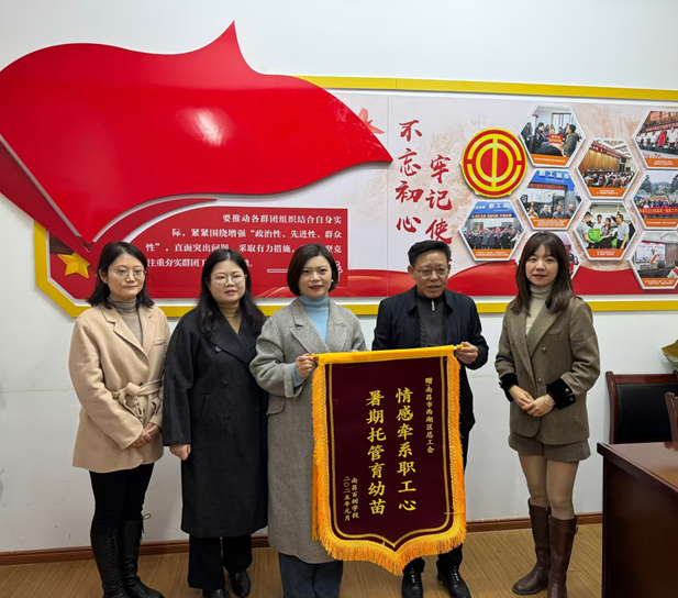 1月2日,南昌百树学校代表来到西湖区总工会,送上一面绣有“情感牵系职工心 暑期托管育幼苗”的锦旗,对西湖区总工会暑期在南昌百树学校为职工子女开办托管班一事表达诚挚谢意。