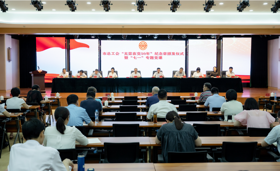 近日,市总工会举行“光荣在党50年”纪念章颁发仪式暨“七一”专题党课活动,市人大常委会副主任,市总工会党组书记、主席刘德辉出席并上专题党课。活动由市总工会党组副书记、分管日常工作的副主席熊绍群主持,市总副县级以上领导出席。