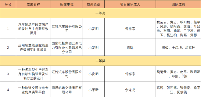 南昌市所选送的“五小”项目获一等奖2个、二等奖2个、三等奖5个。其中,江铃汽车股份有限公司《汽车制造产线突破产能设计自主创新能效提升》和国家电投集团江西电力有限公司新昌发电分公司《运用智慧能源赋能生产数据实时化成果》被评为一等优秀成果。获奖名单如下: