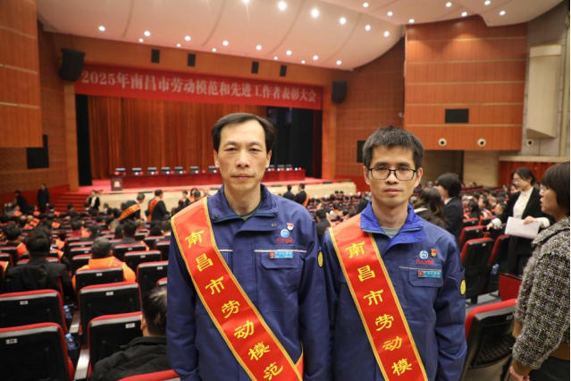 钟海兵(左)、谢辉在2025年南昌市劳动模范和先进工作者表彰大会现场