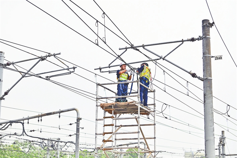 在南昌地铁蛟桥停车场,侯俊和同事进行接触网线岔检修作业。