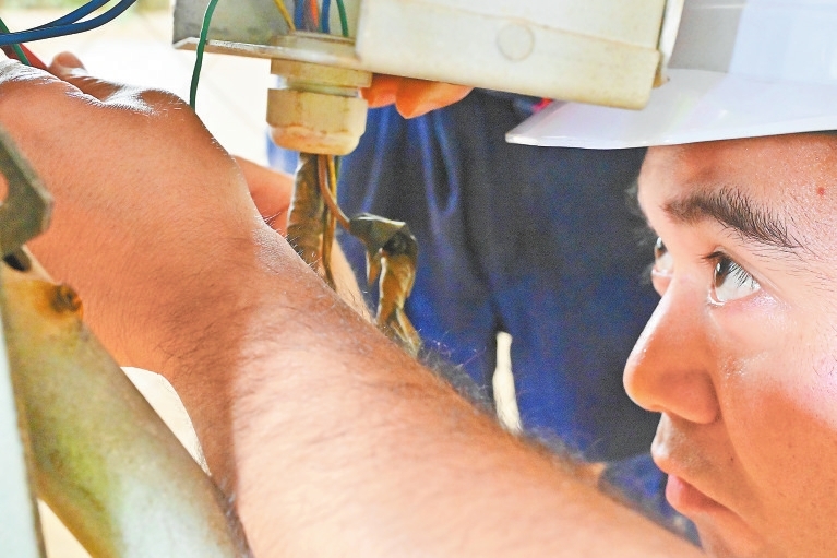 侯俊指导劳模工作室成员排除电动隔离开关故障的技术要领。