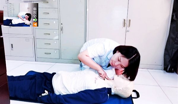 理论授课结束后,培训转入学校实训室,外科教研室讲师万函采用直播的方式进行实操讲学,按照单人徒手心肺复苏操作的流程,每一个步骤分解演示,为了让学生能够有现场的演练效果,指导居家同学采用娃娃、被子等替代式的操练。期间,师生在直播间互动的氛围特别活跃。
