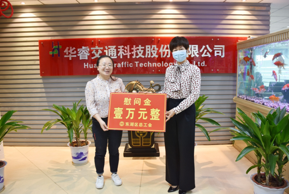 谭阿莉一行先后来到华睿交通科技有限公司、江西省天轴通讯有限公司,详细了解了企业在数字经济领域的生产经营、复工复产、常态化防疫、工会建设、职工服务和生活保障服务等相关工作情况,对企业“重大项目不停工 端午期间不停产”为经济社会发展做出的贡献表示感谢,为他们送上慰问金,并向他们致以节日的问候和祝福。