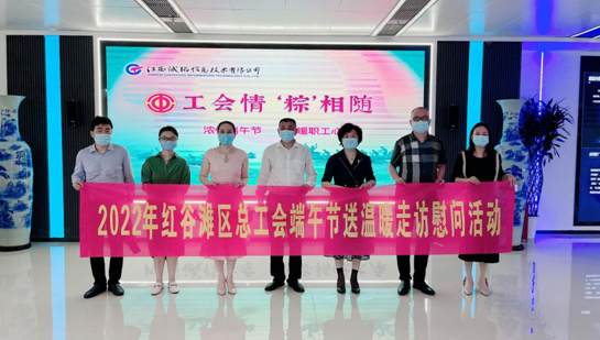 为党和政府的关怀和温暖及时送到节假日期间坚守生产一线的职工心坎上,6月1日,南昌市总工会、红谷滩区总工会联合开展“工会情•‘粽’相随”——端午节期间坚守生产一线职工走访慰问活动。市总工会党组成员、市教科文卫体工会主席钟东;区人大常委会党组成员、副主任,区总工会党组书记、主席王瑞芳出席。市教科文卫体工会副主席黄飞,区总工会党组成员、经审会主任殷芳等陪同。