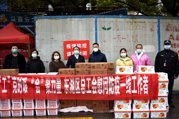 3月22日,东湖区总工会党组成员、副主席提名人选曾纪勇、刘玲一行来到董家窑街道封控点南永和路社区慰问防疫一线干部群众。董家窑街道党工委书记刘志坚,代表董家窑街道工会联合会接受区总工会防疫慰问金13万元。