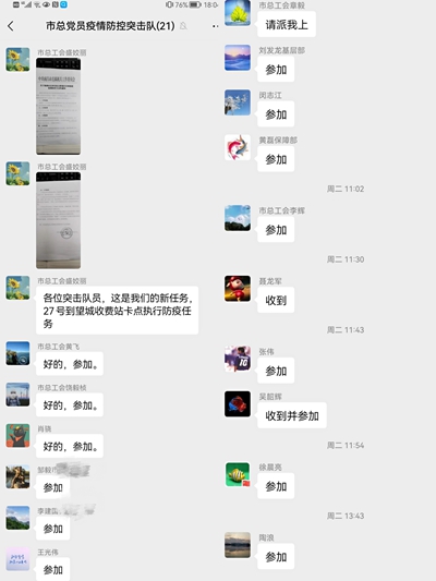 在接到需要抽调人员驻守新建区出城通道疫情防控卡点新任务时,市总党员突击队员再次主动请缨,挺身战“疫”。3月27日-28日,由市总工会党组副书记、常务副主席提名人选熊绍群带队,市总工会党组成员、副主席陈水平和市总工会四级调研员张霖率12名突击队员火速集结,奔赴新建区320国道望城收费站大货车出城通道,开展疫情防控卡点值守。