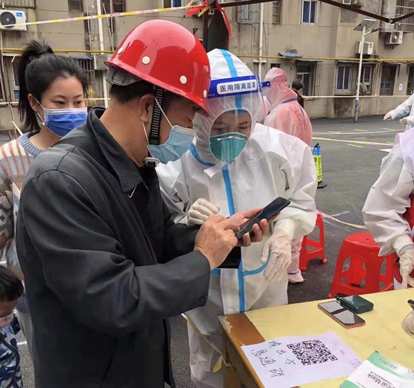 工作现场,区总工会志愿者们帮助群众使用手机生成核酸检测码,进行扫码登记、贴试管标签,做好秩序维护、现场问询等防控工作,全力以赴坚守在社区疫情防控第一线,用实际行动发出工会声音,彰显“娘家人”的情怀和担当。