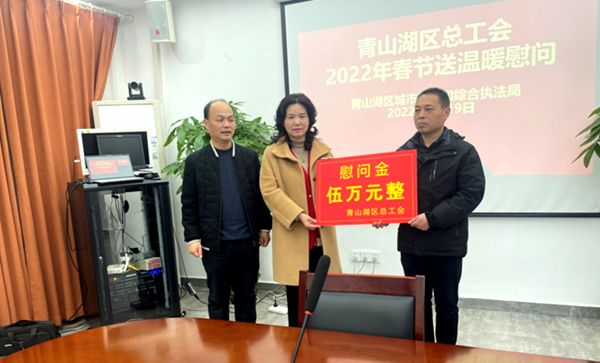 寒冬瑟瑟送温暖,情意绵绵暖人心。在2022年春节来临之际,为进一步开展好工会送温暖活动,1月19日,青山湖区人大常委会副主任,区总工会党组书记、主席缪莉筠,区总工会日常工作负责人胡建山等一行走访慰问区城管局、困难职工和困难劳模,送去党和政府的关怀并致以新春的祝福。