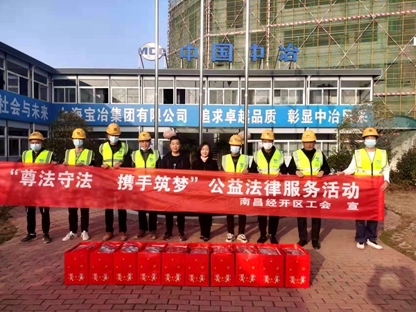 随后,慰问组一行前往创客绿色科技产业园工地、旭辉工地、江西昌昱实业有限公司等单位开展“尊法守法携手筑梦”公益法律服务活动,并慰问奋战在基层一线的农民工,为他们送去春节慰问品及新春祝福。