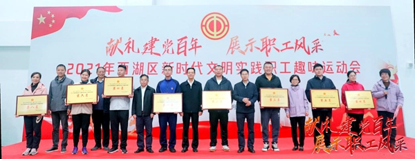 11月21日上午,西湖区新时代文明实践职工趣味运动会在南昌市松柏小学朝阳校区举行。区人大副主任、区总工会主席陈绍国,区政府副区长王光出席并为获奖单位颁奖。