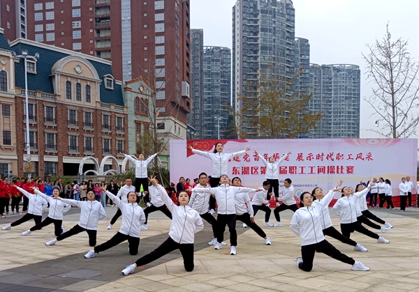 比赛现场,各参赛队队员身着统一队服,伴随着音乐的响起,踏着轻松的节拍,伸展、踢腿、跳跃,每个动作都标准有力,舒展优美,充分体现了东湖区广大职工积极向上、开拓进取的精神风貌,赢得现场阵阵掌声。经过激烈角逐,共评出4个一等奖、5个二等奖、5个三等奖。