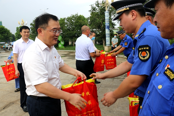 8月19日下午,青云谱区委书记叶修堂走访慰问了坚守疫情防控、文明创建岗位的一线职工,为他们送去了冰糖、绿豆等防暑降温物品,带去了党和政府及工会组织的亲切关怀。区人大常委会副主任、区总工会主席万仁枚,区政府副区长李万汲,滕作鹏以及区委办、区总工会、区城管局、区卫健委等相关部门负责同志陪同。