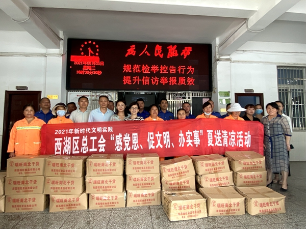 西湖区总工会先后走访慰问了零工经济就业群体、“九大群体”和执勤交警、城管队员、环卫工人、建筑工人、防疫抗洪等一线职工、农民工3600余人,为他们送上防暑降温物品和日常防疫物资,慰问金额达20余万元,把关怀送到职工心坎里,充分体现党和政府及工会对一线的关怀,进一步提振全区职工抵御酷暑凝心聚力打造“城区标杆”、建设“幸福西湖”的士气。