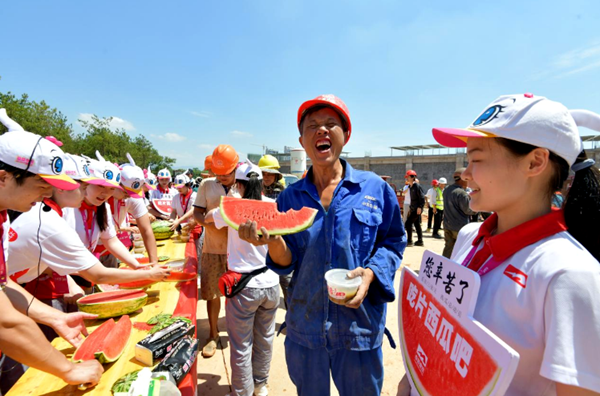 足蒸暑土气,背灼炎天光。溽热难耐的天气并没有影响南昌地铁4号线项目部大干快干的气势,看到工地一线地铁建设者挥汗如雨、战高温斗酷暑的场景,小鲜鹭志愿者们纷纷动容。“大哥,大姐,天气太热了,我们给您送西瓜来了。”现场,可爱的小鲜鹭志愿者唱着欢快的西瓜志愿令迎接工友们下班,以真诚的微笑、专业的礼仪为工友们递上一片片红艳艳的大西瓜,并时不时为他们擦拭额头的汗珠。