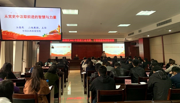 一是开展职工主题宣传教育活动。1.组织工会干部学党史。依托2021年基层工会主席、干部培训班,邀请中共江西省委党校党史党建教研部主任江泰然教授为我区近百名工会主席、干部讲授《从党史中汲取前进的智慧和力量》。2.组织工匠劳模讲党史。组建劳模宣讲团,开展劳模工匠主题宣讲,他们从如何体现劳模精神和提高工作效率入手,用六个词总结了劳模精神:“爱岗敬业、争创一流,艰苦奋斗、勇于创新,淡泊名利、甘于奉献”,与在场人员共勉。3.组织企业干部听党史。区总工会相关干部赴朝阳洲天虹购物中心开展习近平新时代中国特色社会主义思想、视察江西时的重要讲话精神以及中国工会十七大精神“进企业、进车间、进班组”宣讲活动。