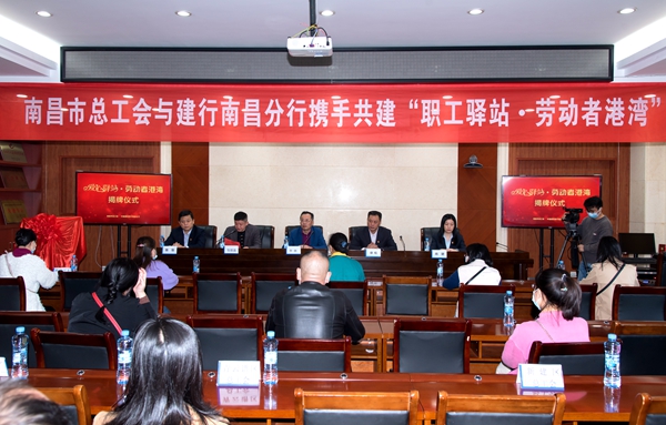 11月9日下午,南昌市总工会和中国建设银行南昌分行举行共建“爱心驿站(劳动者港湾)”揭牌仪式。市总工会党组副书记、常务副主席李林,中国建设银行南昌分行行长徐松分别致辞并为“爱心驿站”揭牌。市总工会党组成员、副主席邹循泷主持仪式。
