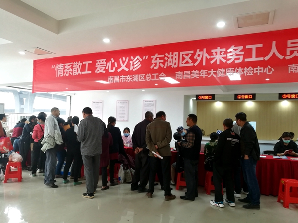 本次活动由东湖区总工会、东湖区贤士湖管理处、东湖区人力资源和社会保障局、东湖区教育科技体育局联合东湖区永溪村、南昌美年大健康体检中心、南昌维乐口腔医院共同举办,在活动现场为务工人员提供测量血压、口腔检查、医师现场问诊、口腔健康宣教、综合性健康指导等免费服务,并为参与活动的务工人员献上爱心小礼物。