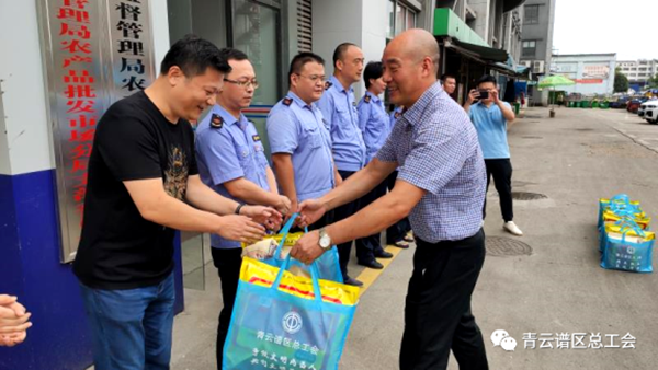 8月12日上午,青云谱区人大常委会副主任、区总工会主席万仁枚走访慰问了在高温下坚守一线的医务人员、执法人员,为他们送去了冰糖、绿豆等防暑降温物品,给炎炎烈日下的一线职工带来了一抹清凉。区总工会、区卫健委、区市管局相关部门负责同志陪同。