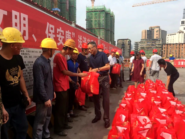 入夏以来,南昌旅游集团工会积极开展“战疫情、促文明、保安康”送清凉活动,7月28日上午,南旅集团党委书记、董事长、总经理李明,党委副书记李虹虹,党委委员、副总经理陈皓等领导,冒着高温,来到我市重点工程“绳金塔民俗风情街”项目,送上绿豆、莲子等爱心礼包,向战斗在一线建设的干部职工表示慰问。李明在听完工程建设情况汇报后,仔细询问了现场工人工作、生活状况,盯嘱项目部要一手抓好工程建设,一手抓好防疫防暑,切实关心工人身心健康,确保职工安全生产,文明施工,为我市创建健康、文明城市作贡献。集团工会办公室、行政办公室、二建公司相关负责人参加此次送清凉活动。