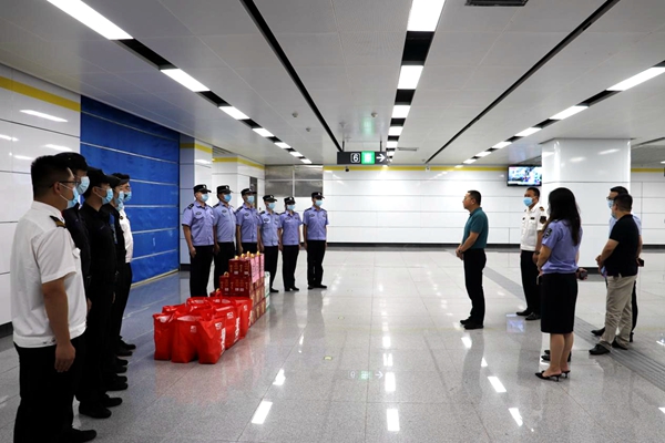 为认真做好夏季劳动保护和防暑降温工作,7月21日上午,南昌轨道交通集团副总经理刘为民带领慰问小组走访了地铁公安第二派出所与青山路口地铁站,先后为地铁公安同志与站内执法、安检同志送去了夏日清凉慰问物资。