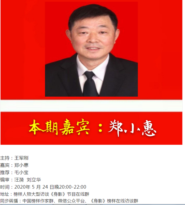 访谈中,郑小惠与大家一道回顾走过的路,畅谈心声愿望,传递正能量。同时,寄语广大网友务必要以榜样人物为标杆,树立正确的人生观、世界观和价值观,胸怀祖国、胸怀大众,从点滴做起、从身边做起、从现在做起,做一个高尚的人、一个纯粹的人、一个有道德的人、一个脱离了低级趣味的人,一个有益于人民的人。