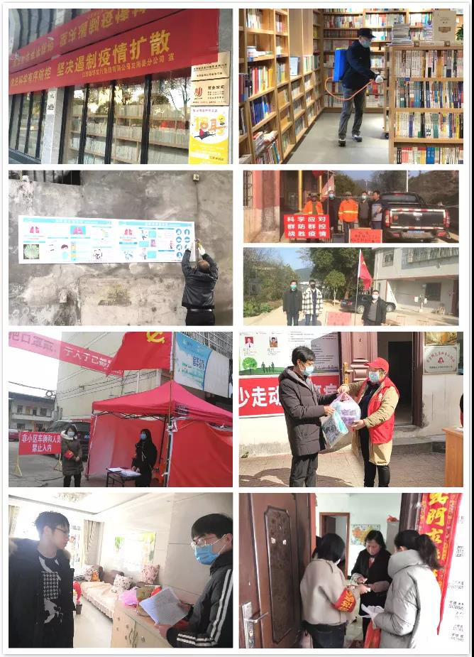 抗“疫”一线,党旗最红。自疫情发生以来,集团下属各分公司党组织发挥基层战斗堡垒作用,团结一心、众志成城、奋力抗“疫”。宜春、抚州、赣州等地区基层分公司充分展现党员先锋模范作用,樟树、南城等分公司党员自发组建疫情防控志愿者服务队伍,积极协助当地政府免费发放疫情防控宣传资料,于都、信丰等分公司领导班子、驻村第一书记带头深入挂点帮扶村镇协助疫情监测、人员摸查,将党旗插在了抗“疫”前线;吉安、上饶、萍乡等地区分公司协助当地疫情防控应急指挥部的部署,开展网格化社区24小时值守防疫工作;南昌、九江、新余、鹰潭、景德镇等地区也积极参与“党建+”基层联防联控工作,留下了江西新华人奋战抗“疫”一线的最美身影。