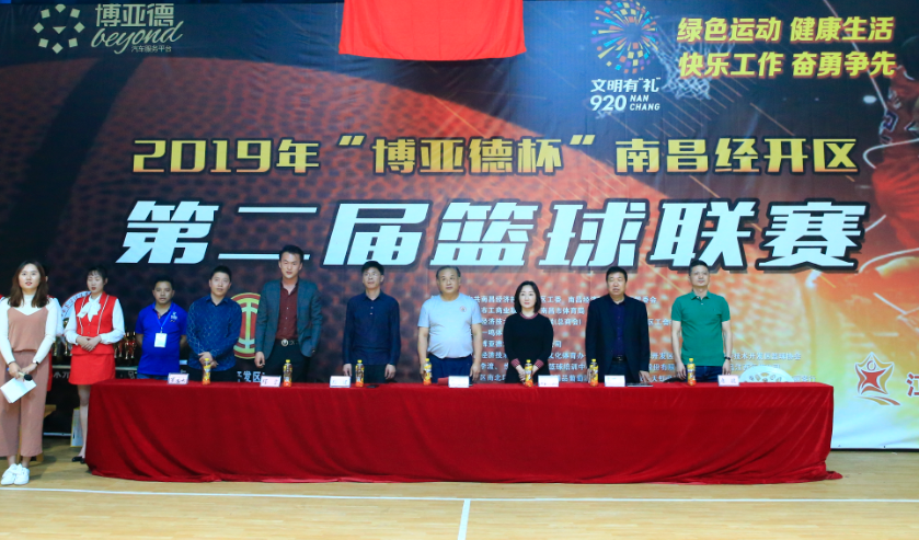 在紧张激烈的篮球赛结束后,2019年“博亚德杯”南昌经开区第二届篮球联赛闭幕式在球馆举行,南昌经开区工会以及相关单位领导出席闭幕式,32支参赛队参加闭幕式。