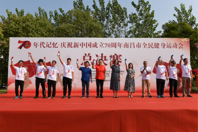 9月12日上午,由南昌市体育局、南昌市总工会、红谷滩新区管委会主办,红谷滩新区文发局、红谷滩新区工会承办的“年代记忆·庆建国70周年”南昌市全民健身运动会在红谷滩新区凤凰洲市民公园隆重举行。南昌市体育局局长杨春,南昌市体育局副局长熊庆峰,市总工会党组成员、女职工委员会主任熊艳,红谷滩新区工会专职副主席许盛容出席并共同鸣笛宣布活动开始。本次健身运动会包括滚铁环、呼啦圈、跳麻袋、挤棍、打陀螺、跳绳、拔河、切水果、俄罗斯方块(电子游戏)等比赛项目,吸引了来自全市各阶层的运动员积极参赛,运动会现场气氛紧张有序,活泼欢快。