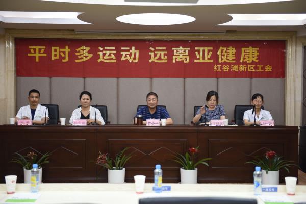 为充分发挥红谷滩新区工会“三师”(律师、健康工程师、心理咨询师)--健康工程师服务团队的积极作用,按照“五学五家--学健身、以康强家”活动部署。5月28日,红谷滩新区工会根据机关单位主要工作方式以及现代网络学习生活特点组织开展“平时多运动、远离亚健康”为主题的关爱职工健康活动。区工委委员、管委会副主任罗小平出席,区工会专职副主席许盛容主持。活动邀请了康桥体检中医总监、国家中医药管理局亚健康分会理事、首席讲师杨东艳主任等三名专家医师为职工讲解颈椎病自我保护和调理,并现场为大家进行把脉和触诊。本次活动旨在通过学习和锻炼,有效提升广大职工身体素质,营造健康向上的生活方式,以更加饱满的精神和健康的体魄投入到红谷滩各项事业发展中去。