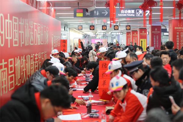 1月13日正逢传统腊八节,地铁大厦站厅内笔墨飘香、年味浓厚。集团工会、团委联合中国书协、江西文联、江西日报传媒集团有限公司、南昌江报轨道广告传媒有限公司、江西省书法家协会、江西四特集团举办了“中国书协送万福进万家暨南昌地铁迎新春送万福”活动。