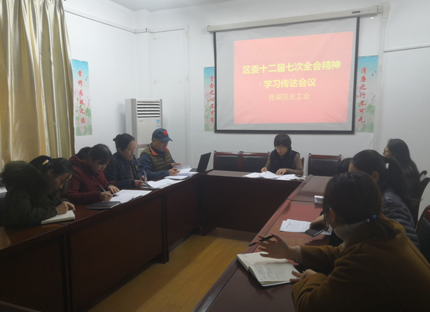 1月3日下午,西湖区总工会在群团会议室组织召开机关全体人员会议,及时学习传达区委十二届七次全体(扩大)会议精神,会议紧紧围绕工会工作“基、本、难、源、计”五字箴言,聚焦主责主业、深挖改革潜力、深化“6123”工程,切实把思想和行动统一到区委的要求上来,奋力开启2019年西湖工会工作高质量发展新进程。