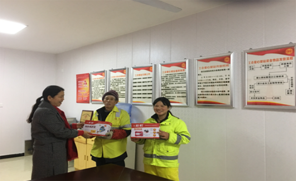 下午三点,社区爱心驿站工作人员将暖手宝慰问品送到环卫工人手上,并嘱咐他们注意保暖,多喝热开水,他们脸上露出了幸福的笑容。