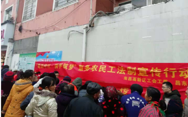 进一步提高农民工法治意识和道德自觉,依法依规理性表达利益诉求,自觉维护社会和谐稳定,12月11日上午,高新区工会工委联合江西师范大学政法学院法治宣传小分队在南昌高新区长胜大市场举办了“尊法守法·携手筑梦”服务农民工法治宣传暨“法制宣传月”大型宣传咨询活动。此次活动主要针对长胜大市场商户及周边居住农民工,为他们宣讲法律知识,并现场解答法律问题。