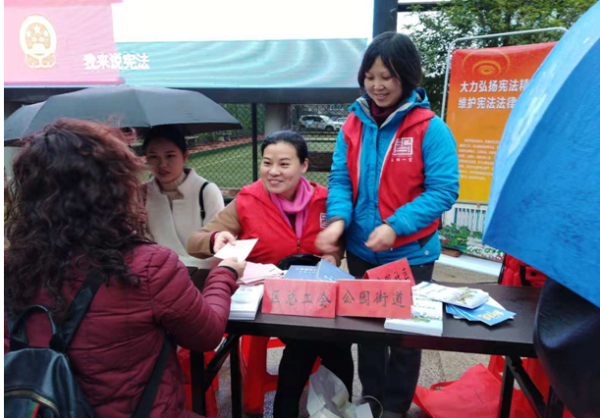 为深入推进我区“七五”普法规划实施,大力宣传以宪法为核心的中国特色社会主义法律体系,进一步弘扬宪法精神,普及宪法知识。在第五个宪法宣传日来临之际,东湖区总工会积极参加东湖区司法局举办的“美丽东湖 幸福家园 法治护航”主题宣传活动。在现场,区总工会工作人员为大家发放《江西省女职工劳动保护特别规定》、《工资集体协商实用手册》等宣传册,为女职工讲解女职工孕期、哺乳期应当享受的劳动权利和禁忌从事的劳动范围,受到了现场职工群众的欢迎。
