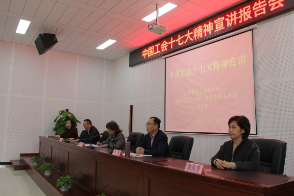 宣讲前,南昌国资产业经营集团有限公司党委副书记、工会联合会主席汤剑峰致欢迎词。在宣讲中,省总工会林玉华主席向与会人员介绍了大会盛况,重点传达了习近平总书记同中华全国总工会新一届领导班子成员集体谈话时发表的重要讲话精神、李克强总理在中国工会十七大上所作的经济形势报告、王沪宁代表党中央发表的致词以及王东明所作的工作报告。林玉华对中国工会十七大的新理论、新观点、新要求进行了分析和详细解读,对新时代产业工人队伍建设改革和工会工作改革创新的实际进行了阐述,将党中央的声音带到了企业,传达给了基层一线职工。