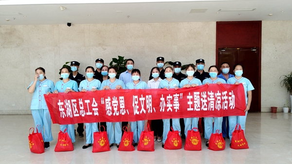 8月5日下午,东湖区总工会常务副主席唐浩来到为区政府大楼服务的洁佳物业东湖站,给物业公司80余名在一线工作的保安员、保洁员送上价值一百多元的绿豆、冰糖等清凉物资,感谢他们在炎炎夏日不畏酷暑,辛勤劳动,为我们创造良好的工作环境。