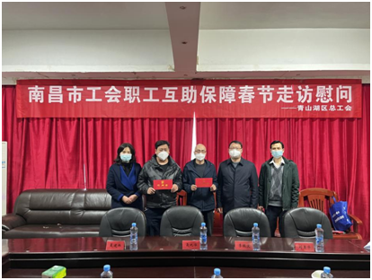 近日,省职工保障互助会副秘书长聂九华一行赴青山湖区开展春节走访慰问活动。区人大常委会副主任、区总工会党组书记、主席缪莉筠陪同。