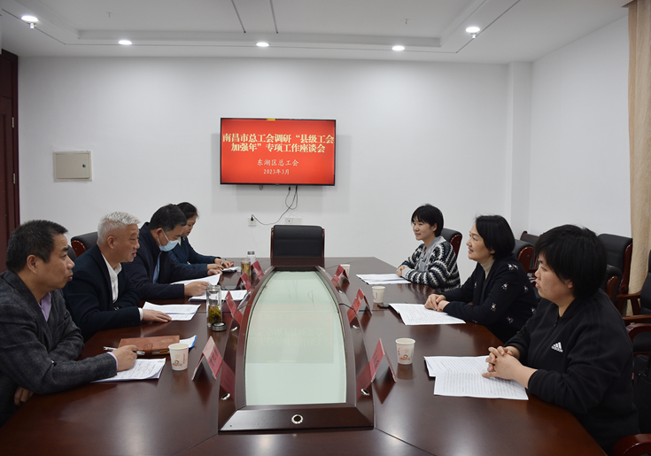 3月16日,南昌市总工会三级调研员熊艳、女工部部长盛姣丽一行赴东湖区调研“县级工会加强年”专项工作。东湖区人大常委会党组成员、副主任、区总工会党组书记、主席周春雷陪同调研。