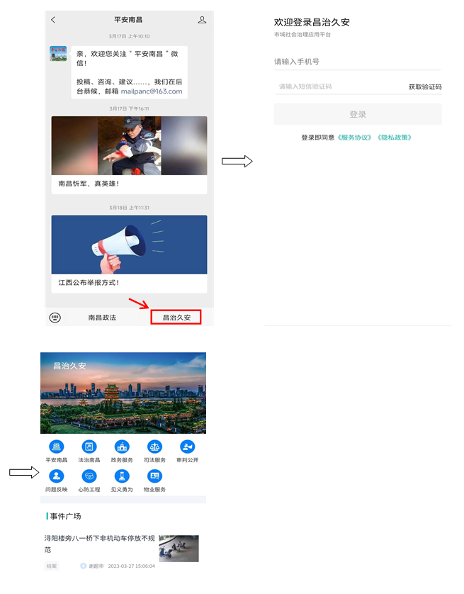 方式三:关注“平安南昌”微信公众号——点击下方“昌治久安”功能按钮——进入“昌治久安”界面(首次登录需输入手机号获取短信验证码进行身份认证)