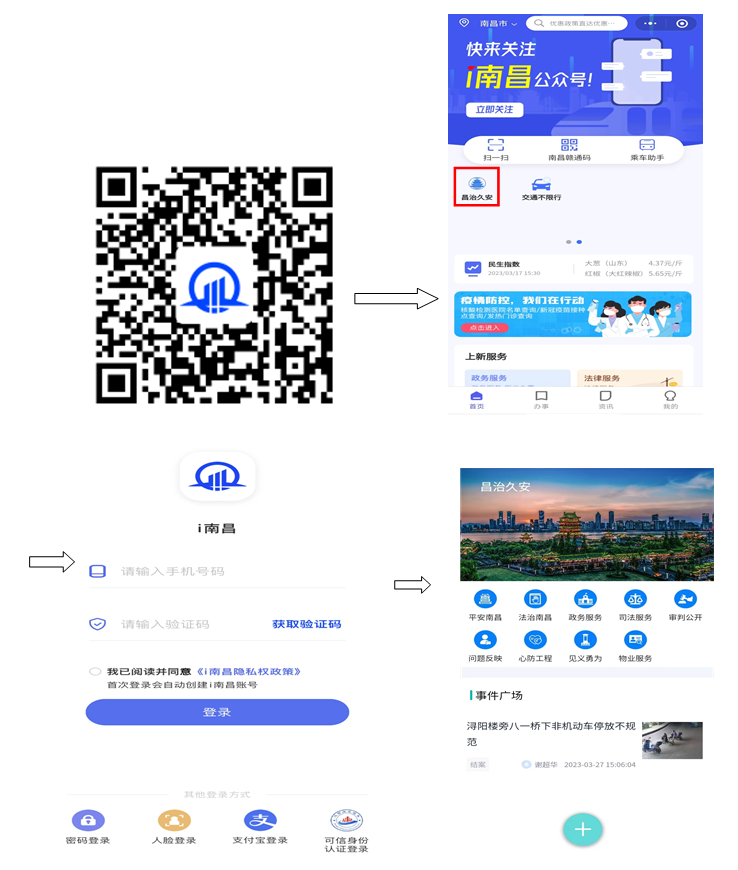 方式一:手机浏览器、微信、QQ“扫一扫”扫描下载“i南昌”APP——点击“昌治久安”功能按钮——进入“昌治久安”界面(首次登录需输入手机号获取短信验证码进行身份认证)