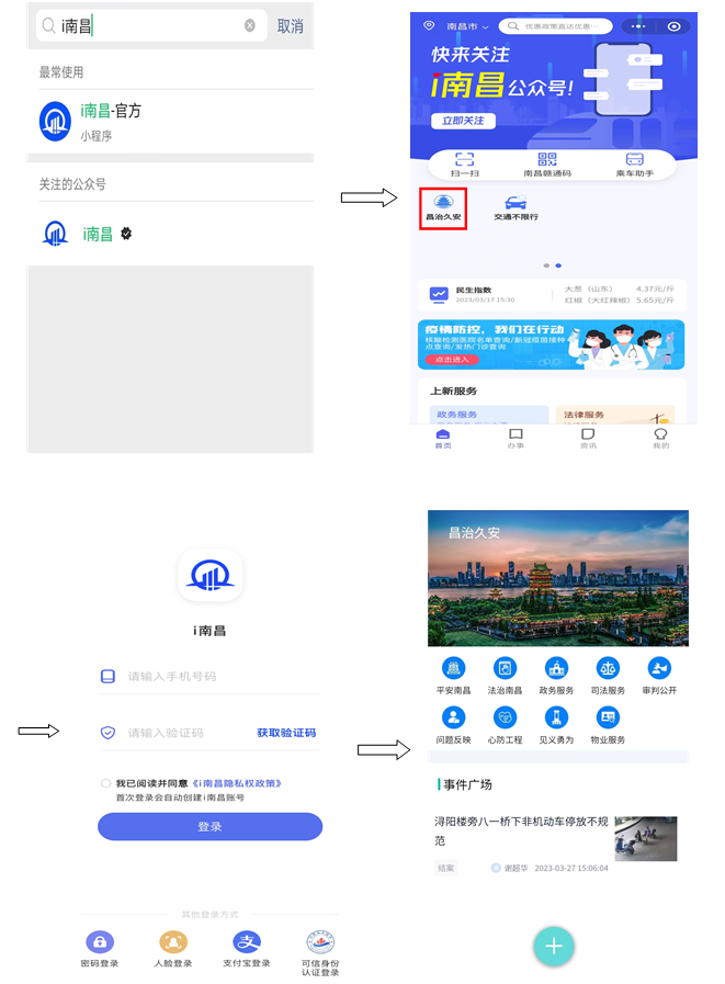 方式二:微信搜索“i南昌”小程序——点击“昌治久安”功能按钮——进入“昌治久安”界面(首次登录需输入手机号获取短信验证码进行身份认证)