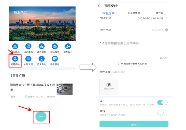 进入“昌治久安”界面——点击“问题反映”或者“+”按钮上报事件。